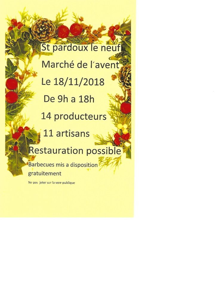 MARCHE NOEL ST PARDOUX ‹ Retour à Animations, Manifestations Posté le 3 novembre 2018 de Nathalie Le Gall — Aucun commentaire ↓